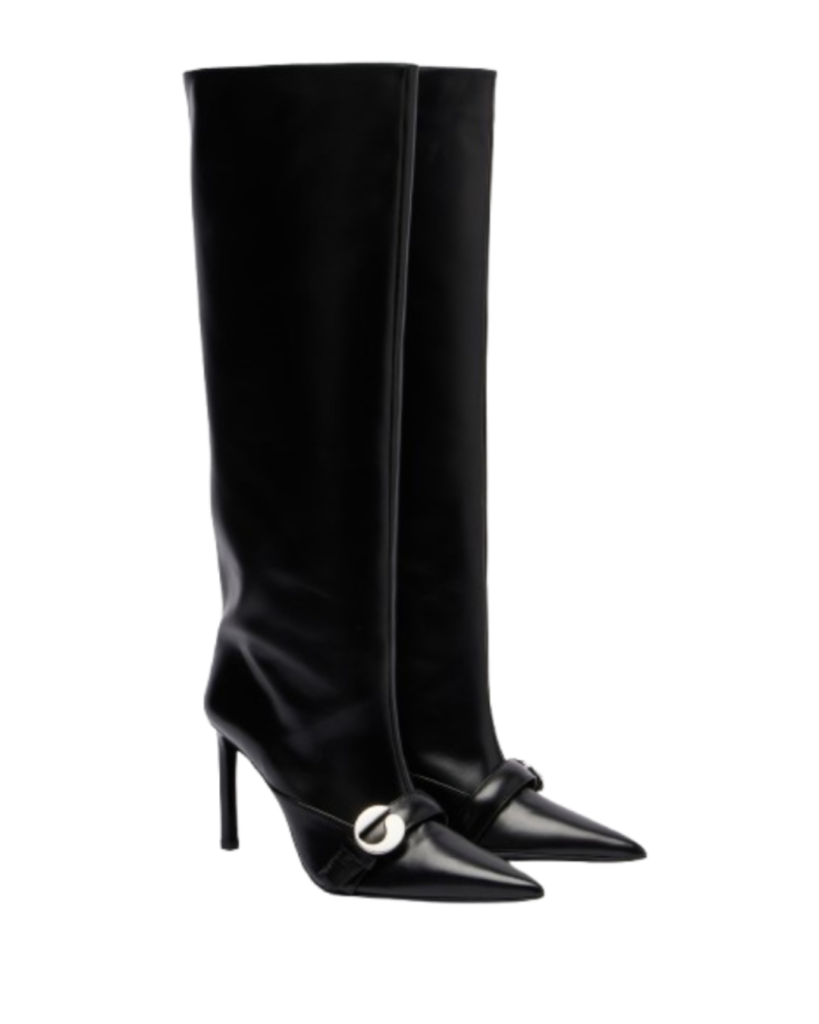 Coperni does that particular kind of clean, futuristic minimalism that photographs insanely well. Their logo knee-highs are streamlined and sharp, with Mytheresa noting a ~8.5 cm heel and tall shaft proportions, basically engineered to make legs look longer and outfits look cooler. Wear them with a micro-hemline and a big coat for the best contrast.