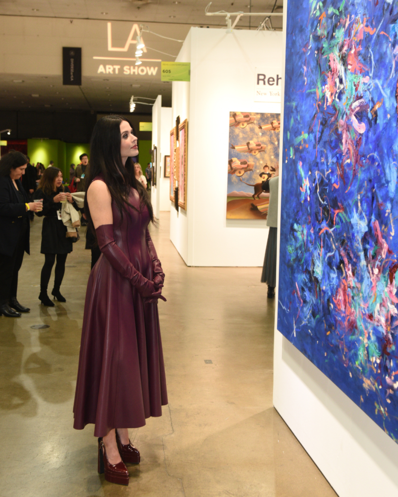 Strolling through the galleries, it was impossible not to feel the creative rhythm of the show. The mix of art, fashion, and personality was alive in every corner with each booth feeling like its own small stage. Under the direction of Producer and Director Kassandra Voyagis, the 31st edition of the LA Art Show leaned into intersections between art, music, and film. Works by Sylvester Stallone shared space with pieces from Paul Simonon of The Clash and contemporary artist Chris Rivers, creating moments where pop culture and gallery-ready precision effortlessly met.