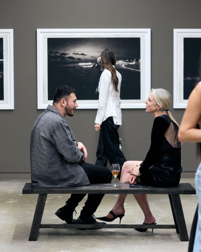 Gerber circulated the room all night, mingling with friends and fans, answering questions, and pausing with guests as they studied his work. No velvet rope between artist and audience, just conversation, curiosity, and a steady hum of bass carrying through the room.