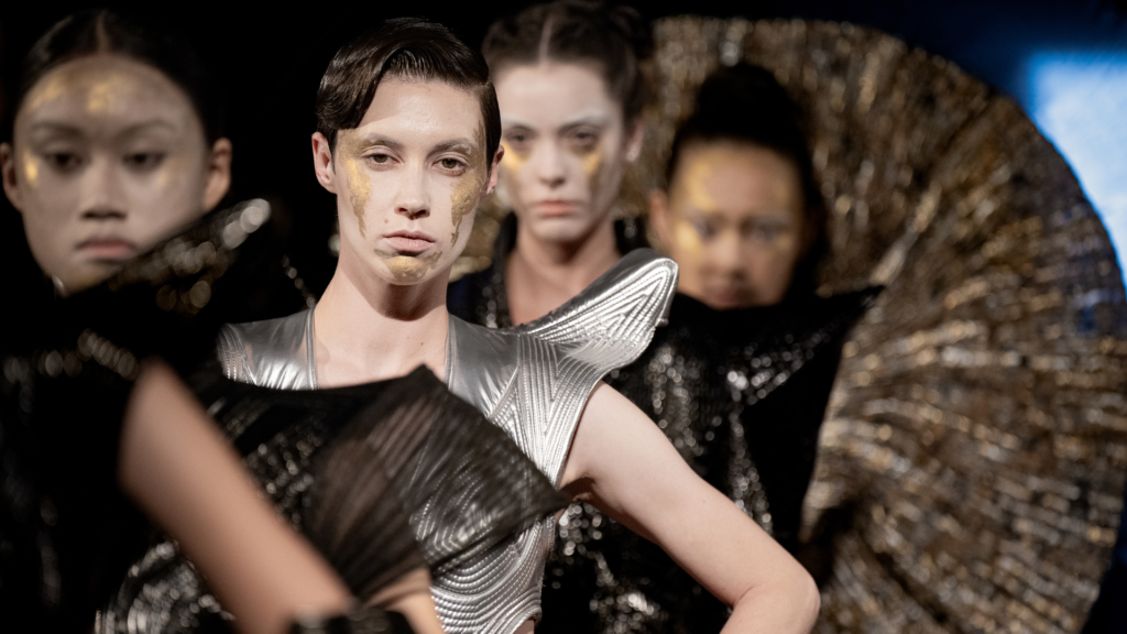 The evening offered plenty to admire, but one mid-show highlight came courtesy of Hallmarq’s collection, when a model didn’t just walk the runway, they vogued down it. Mid-strut, they broke into a full voguing sequence at the end of the runway, striking poses that had the crowd cheering, phones raised and jaws dropped. It was pure ballroom homage, the kind that inevitably calls back to Paris Is Burning, where voguing first entered cultural mythology. For a split second, I almost considered leaving my seat and joining them.