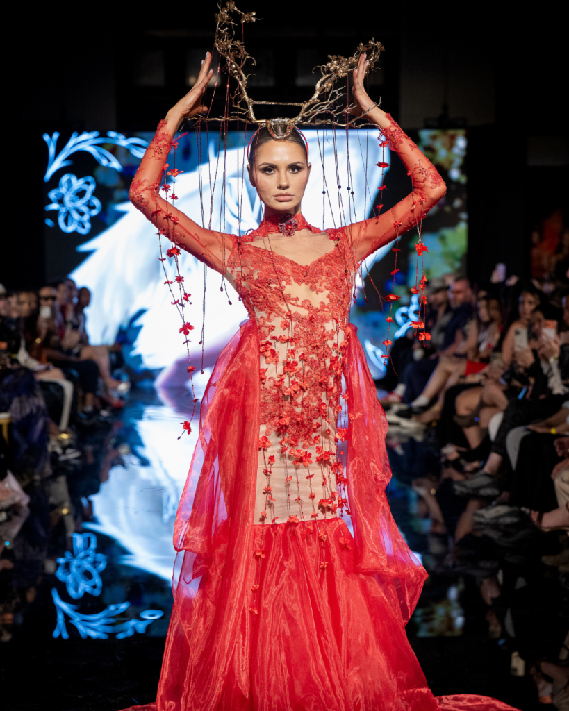 Each look made its way down, collecting quiet gasps and murmurs of admiration. I found myself pulled toward the darker corners of the lineup, like Bad Pink, Scathed Fashion, Richard Hallmarq, and Morfium Fashion. They all leaned into moodier palettes, striking patterns, and daring silhouettes, delivering looks that felt dramatic and unapologetically bold. Across the spectrum, Angelo Estera offered a completely different fantasy: delicate lace, pastel hues, and gowns so intricately embellished they radiated a royal elegance.