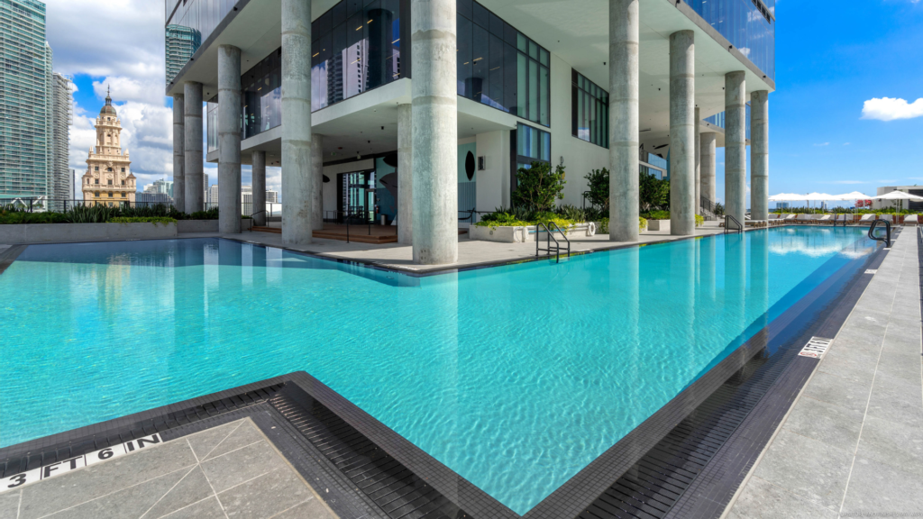 For a larger-scale rooftop pool experience, The Elser Hotel & Residences delivers one of the most expansive pool decks in Miami. The 19,000-square-foot rooftop space features a 132-foot resort-style pool overlooking Biscayne Bay, PortMiami, and South Beach. Daybeds and chaise lounges create a flexible layout that works for both social groups and relaxed sunbathing. A massive LED screen plays music videos, movies, and live sports, adding an extra layer of entertainment throughout the day. There is also a rooftop hot tub with panoramic skyline views, along with wellness programming such as yoga and fitness classes. It is a balance of indulgence and lifestyle that defines modern Miami luxury.