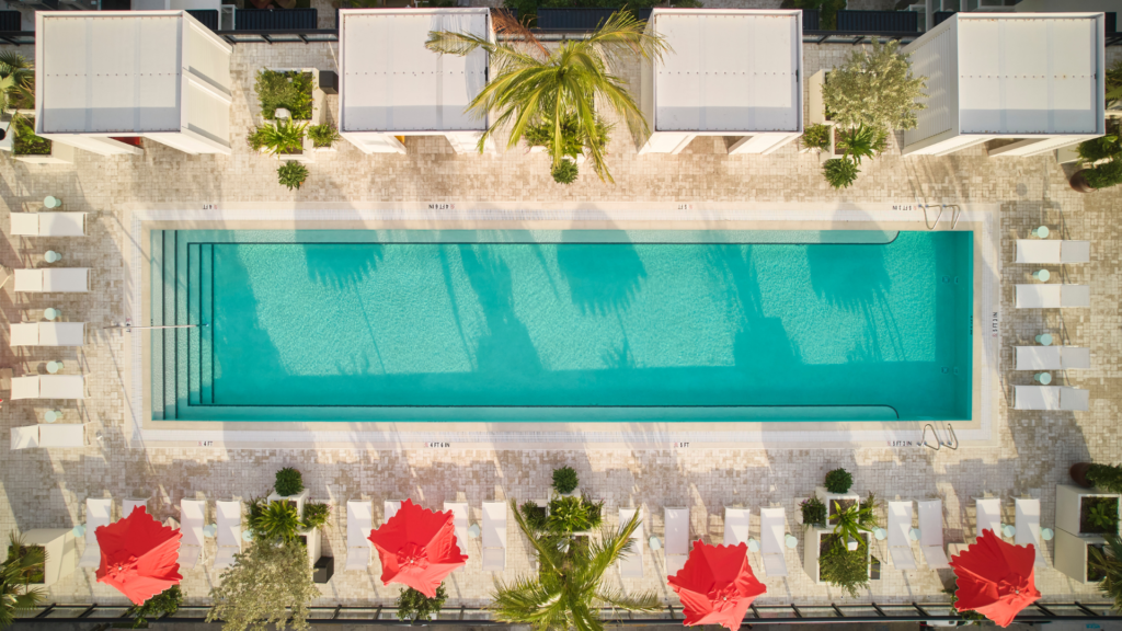 In South Beach, The Betsy – South Beach brings a more classic and refined take on the rooftop pool with bar concept. Set within the Art Deco Historic District, the rooftop infinity pool overlooks the Atlantic Ocean and the Miami skyline, offering one of the most scenic vantage points in the city. Full bar and food service keep everything within reach, making it easy to settle in for the afternoon. The setting feels cinematic yet relaxed, balancing quiet luxury with social energy. For those looking for something more low-key, the hotel’s courtyard pool offers a lush, tranquil alternative, but the rooftop remains the main attraction for views and atmosphere.