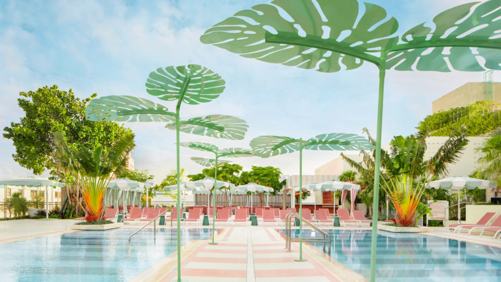 Then there is The Goodtime Hotel, home to The Pool at Strawberry Moon, one of the most talked-about rooftop pool clubs in Miami. Spanning 30,000 square feet, the space is designed to capture attention. Inspired by 1950s Acapulco and Havana, the aesthetic leans into pastel tones, striped tiles, and palm-shaded cabanas that feel both nostalgic and highly photogenic. Two pools run parallel with a central runway that acts as a social focal point. The open-air bar keeps cocktails flowing, while weekend programming brings in top DJs, VIP cabanas, and full-scale day parties. This is where Miami pool culture fully comes to life, blending hospitality, nightlife, and social energy into one experience.