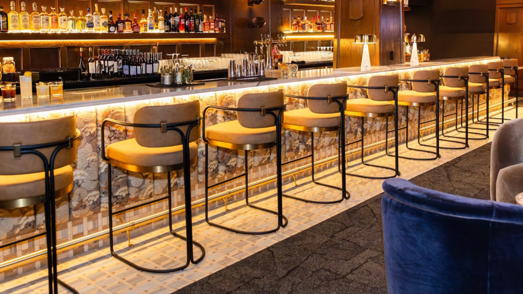 Set within the former London Grill space at the Benson, Honorable Mention immediately distinguishes itself from the traditional sports bar format. Instead of rows of televisions and crowded high tops, the venue leans into Victorian-inspired elegance paired with a modern open-concept layout. Curated local artwork lines the walls, sightlines are carefully designed so every seat captures the action, and intimate lounge areas create spaces for conversation as easily as game day celebrations. The result feels less like a bar built around a screen and more like a social clubhouse where sports culture is the connective thread.
