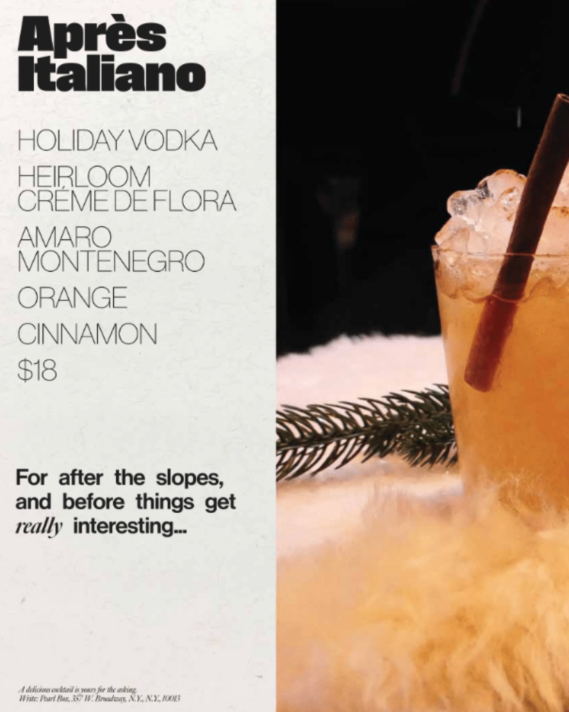 If Aprés Italiano is the first chapter, it is already a very good one. And if the centerfold drink at Pearl Box is any indication, Holiday Vodka’s New York takeover is just getting warmed up.