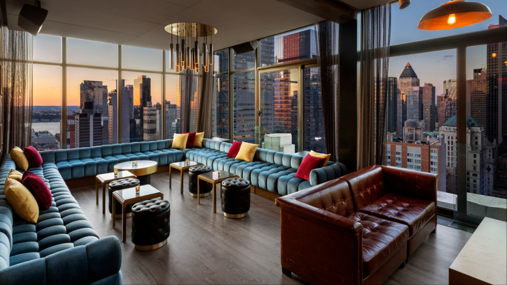Perched 30 floors above Midtown, The Skylark delivers one of the most coveted rooftop New Year’s Eve parties in NYC. Guests enjoy direct views of the Times Square Ball Drop, sweeping skyline vistas, and a polished crowd dressed for the occasion.