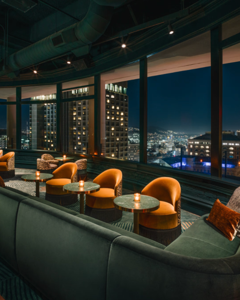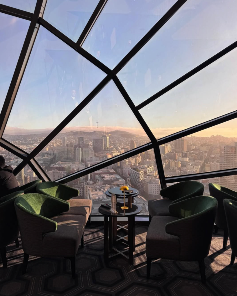 There’s a cinematic shift that hits when you’re holding a cocktail 20 floors above San Francisco, the city glowing beneath you. Fog weaves between towers, the Bay Bridge starts its nightly sparkle, and suddenly the skyline feels like the main event.